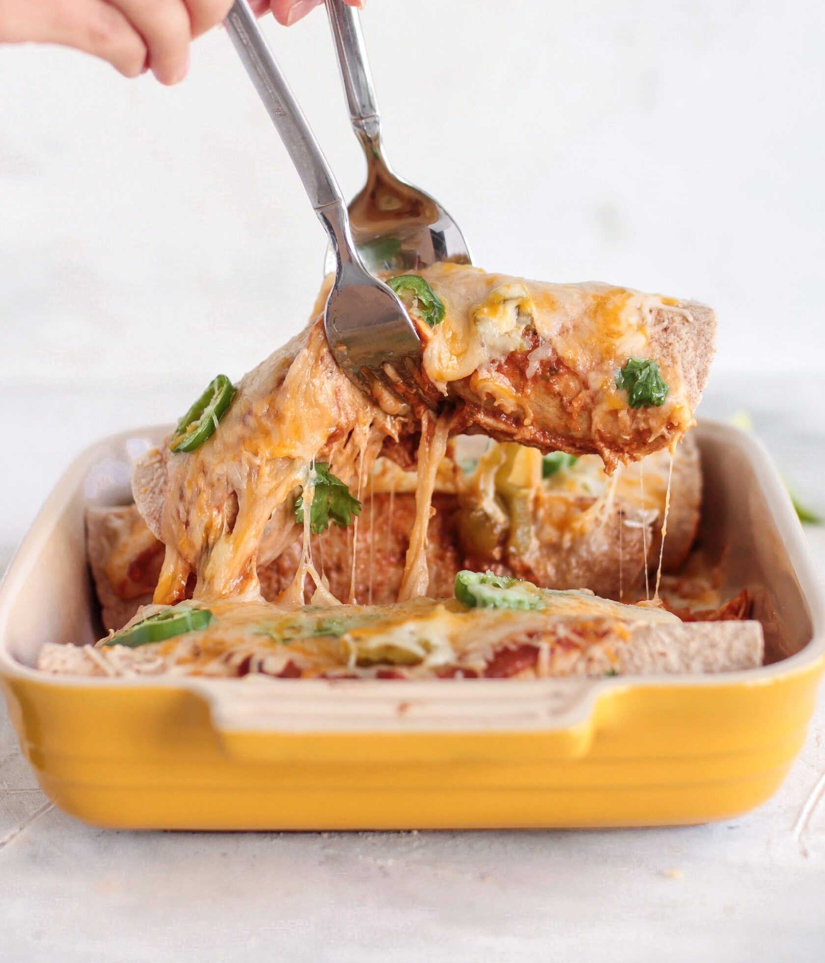 4. Каждую тортилью сверните в трубочку и выложите плотно друг к другу швами вниз сверху соуса в форму для запекания;